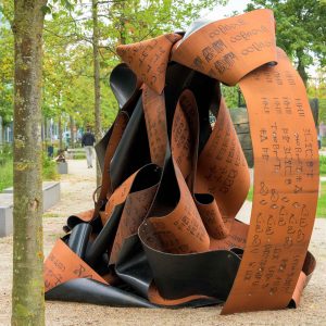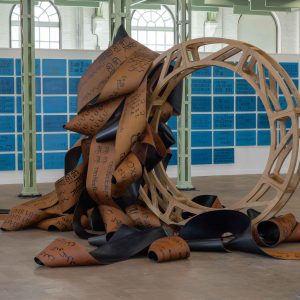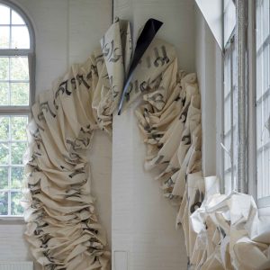 Cecilia Rebergen’s sculptures and installations are both powerful and physical, as well as appealing to the intellect. Here’s the thing: for the sculptures, she likes to use large, heavy, folding materials such as rubber, canvas or textiles. These are twisted into graceful strings. On the flat, even surface, Rebergen paints letters and pictorial marks from notebooks around the world. Her work can be seen as an exploration of how to capture something as elusive as communication in writing.