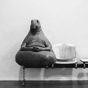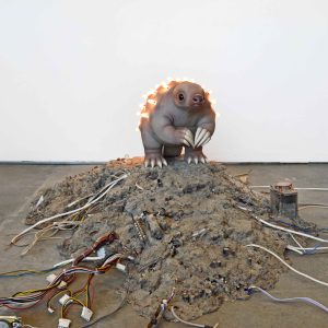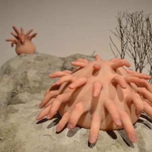 The hyper-realistic sculptures by Margriet van Breevoort (on the right in the photo) immediately capture your attention. From an extremely realistic creature with the head of an elephant seal to a futuristic species resembling a pig: the sculptures are figurative and meticulously detailed, yet always with a surreal twist. Van Breevoort constantly plays with the audience’s imagination: what is possible, what is not? What is ‘natural’ and what is man-made?