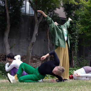 In her work, Jonker places the human body within self-made spaces, which she calls scenarios. These scenarios can be material, made from materials like protective sheets, (corrugated) cardboard, wood, and PVC. But they can also be immaterial, formed by the framing of choreography. In the latter, the proportions of the human body and endurance play a significant role. Here, Jonker plays with the question: does the human body shape itself to the space, or is the space shaped by the human body?